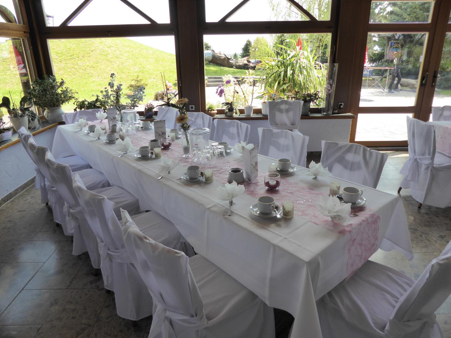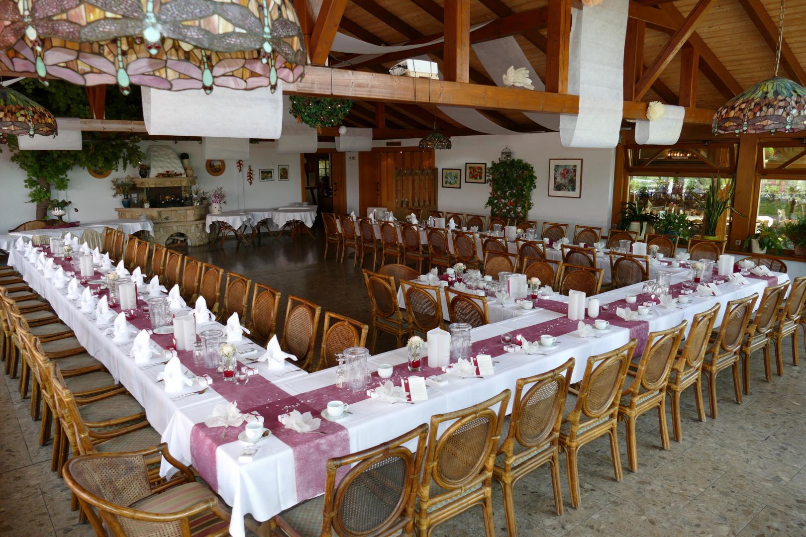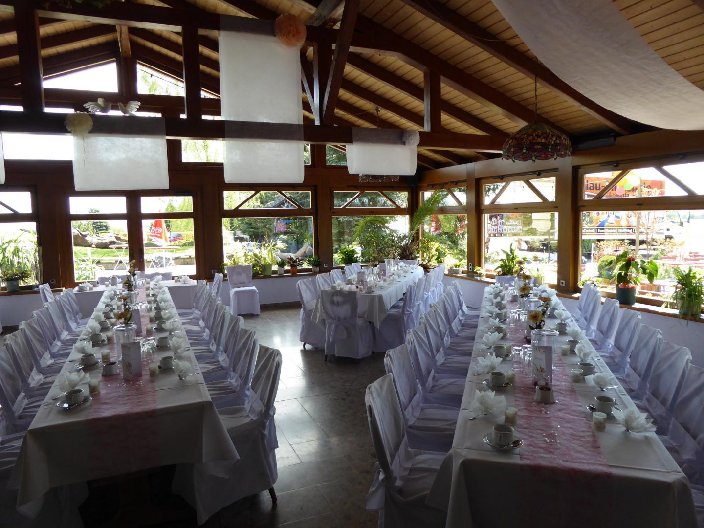 Lichtdurchflutet, hell und freundlich strahlt dieser Raum ein besonderen Flair aus und ist beliebt für Hochzeits- und größere Familienfeiern.