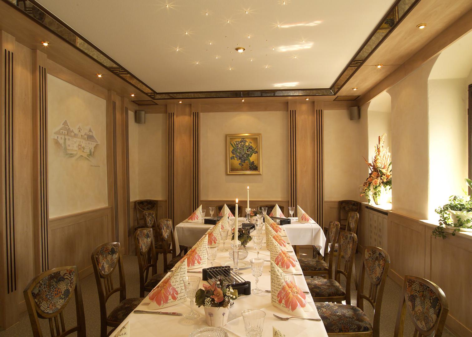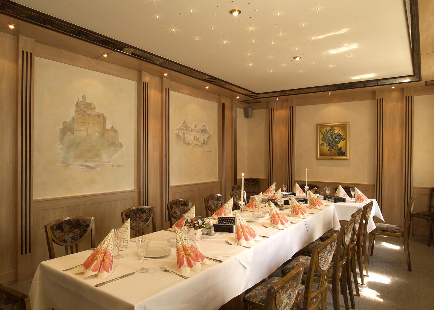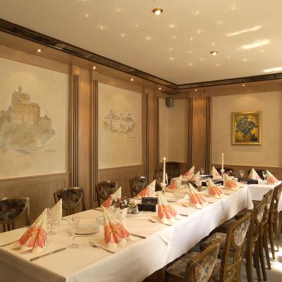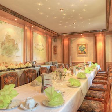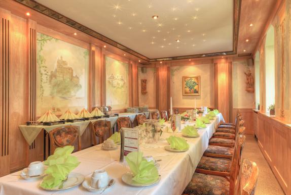 Geeignet für kleine und mittelgroße Familienfeiern. Die Wände sind gestaltet mit den 3 Burgen und Schlössern unserer Region.