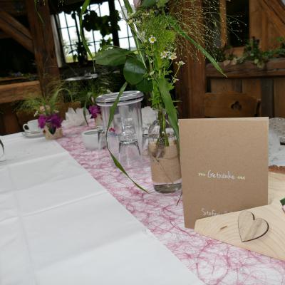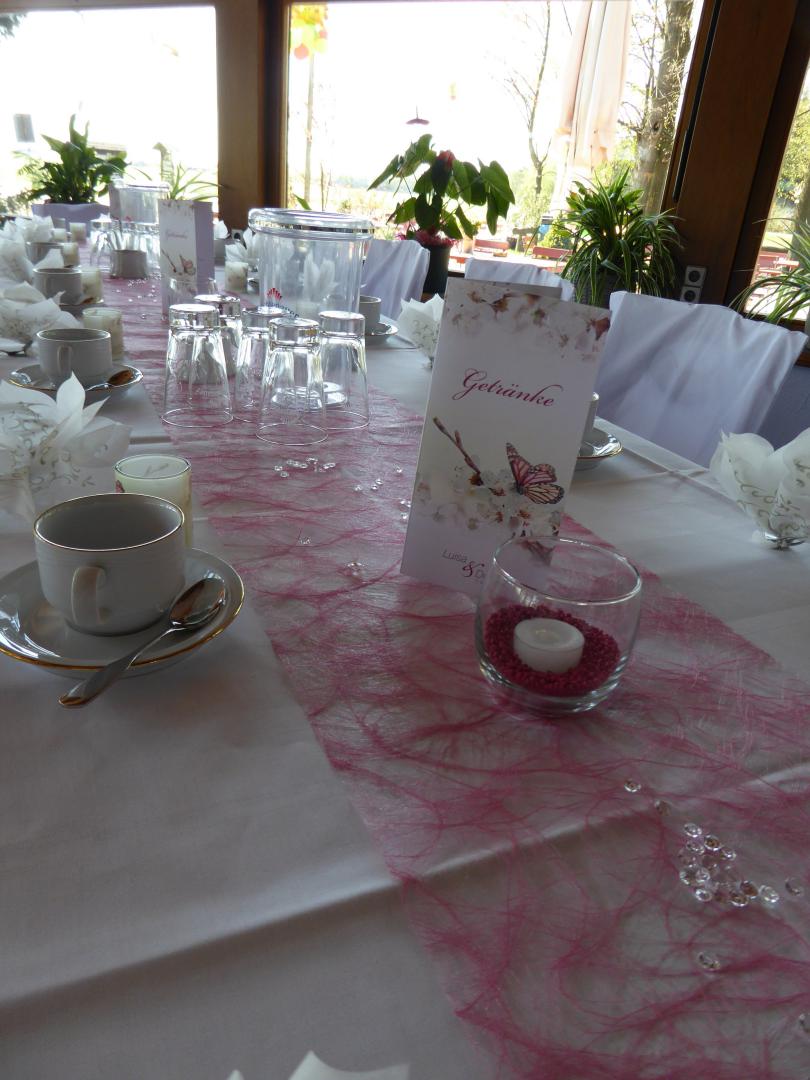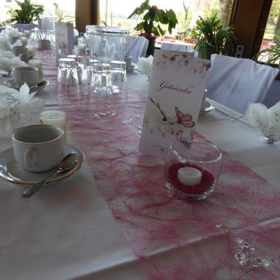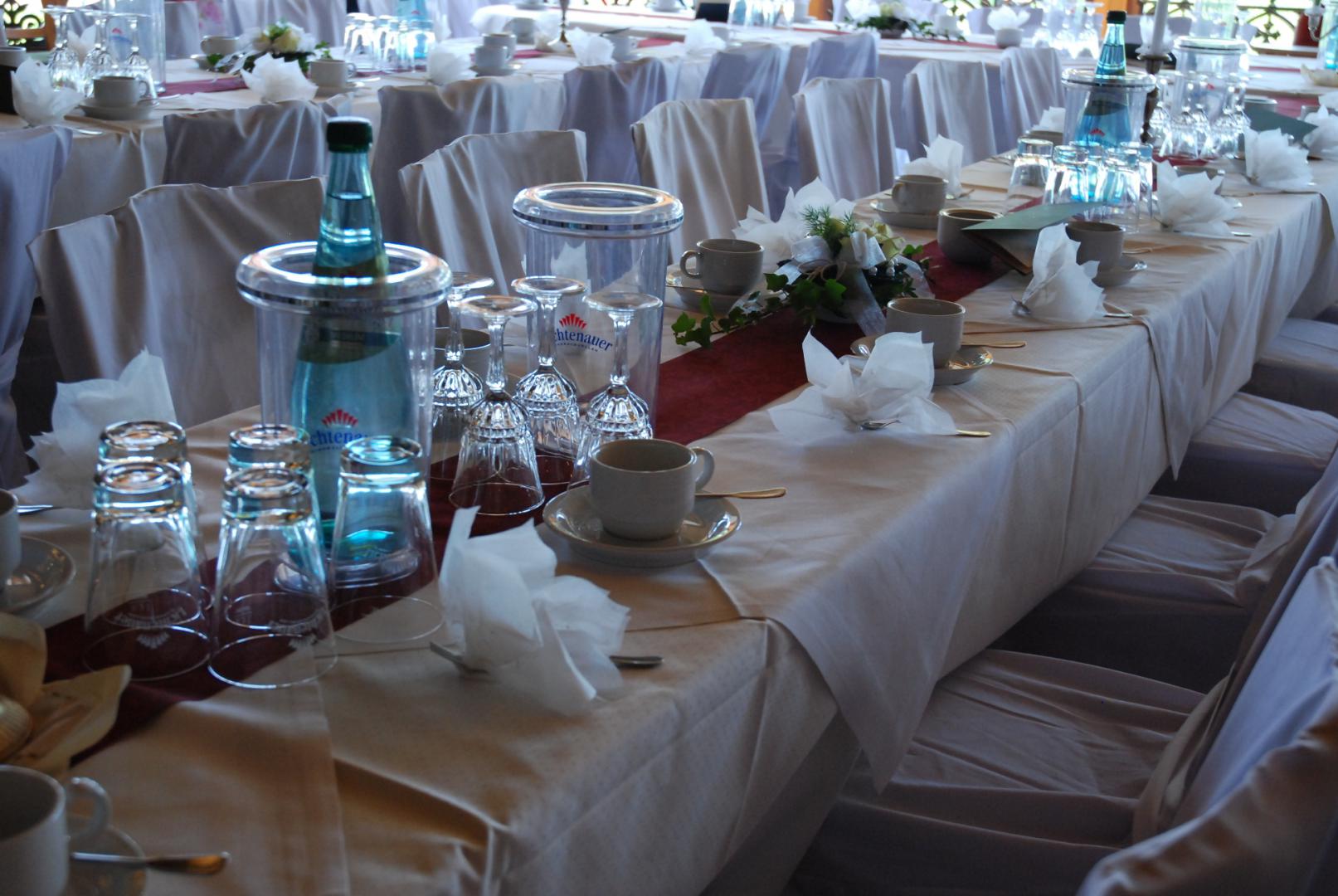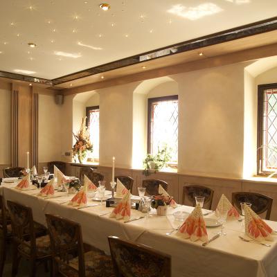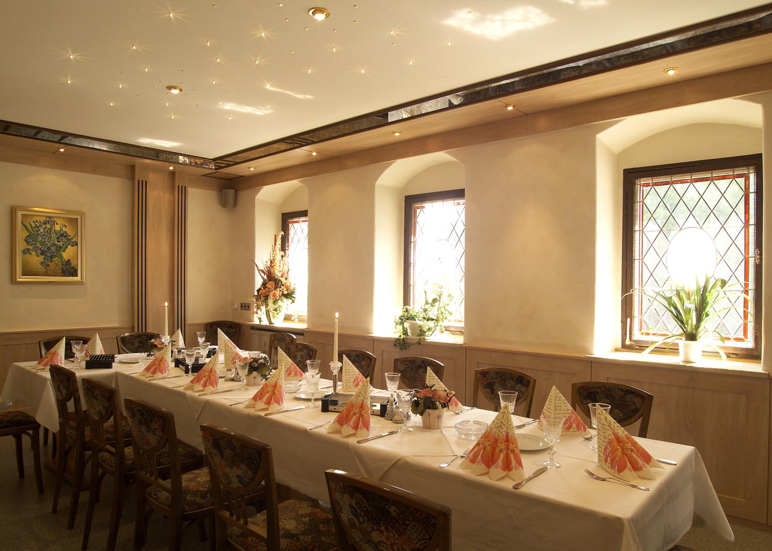 Geeignet für kleine und mittelgroße Familienfeiern. Die Wände sind gestaltet mit den 3 Burgen und Schlössern unserer Region.
